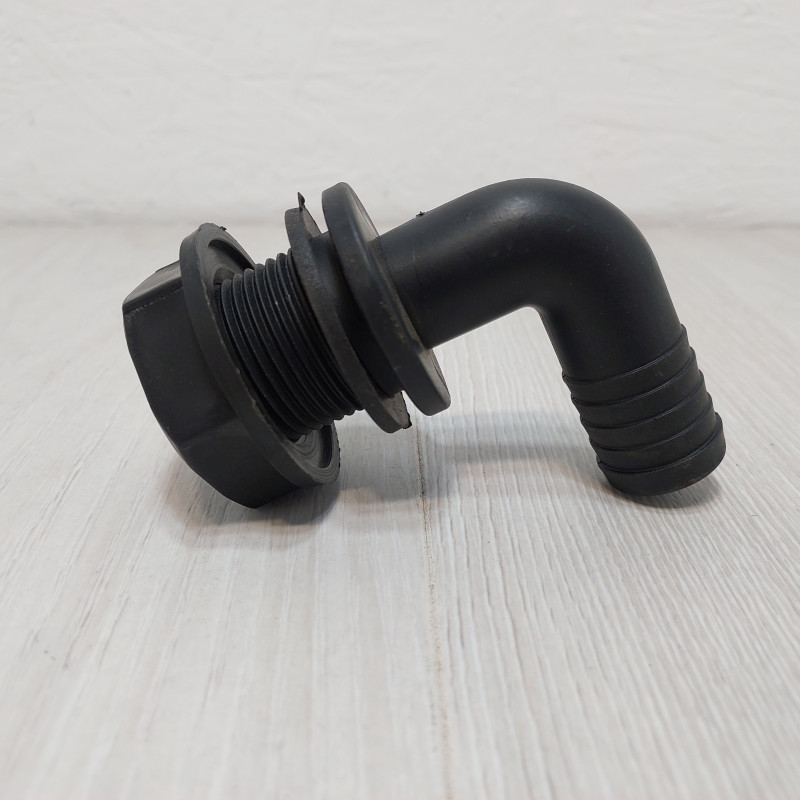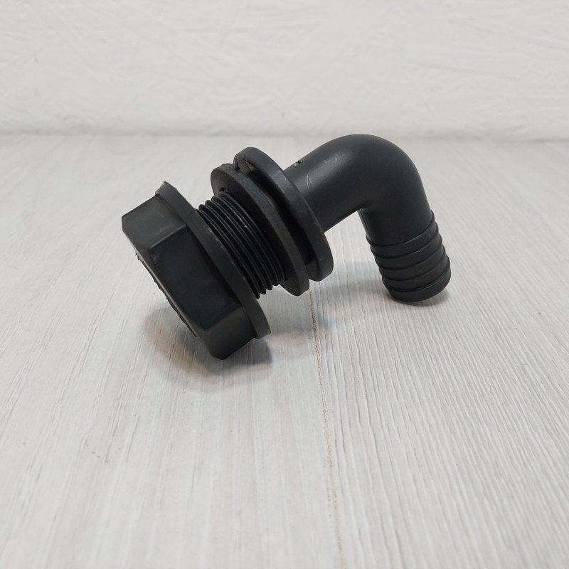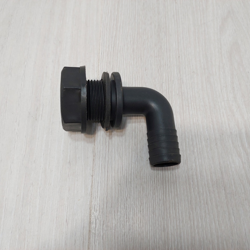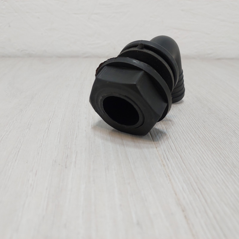 Деталь обеспечивает возврат излишка рабочей жидкости из регулятора давления обратно в бак опрыскивателя через обратную линию. Конструкция выполнена в виде углового фитинга L-образной формы с ребристым штуцером диаметром 25 мм для крепления шланга и резьбовой частью для монтажа через стенку бачка. Переливное колено изготовлено из химически стойкого полимера, выдерживающего контакт с агрессивными препаратами и КАС. В комплект входят уплотнительная прокладка и прижимная гайка для герметичной фиксации.
