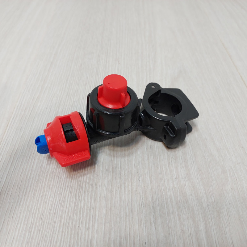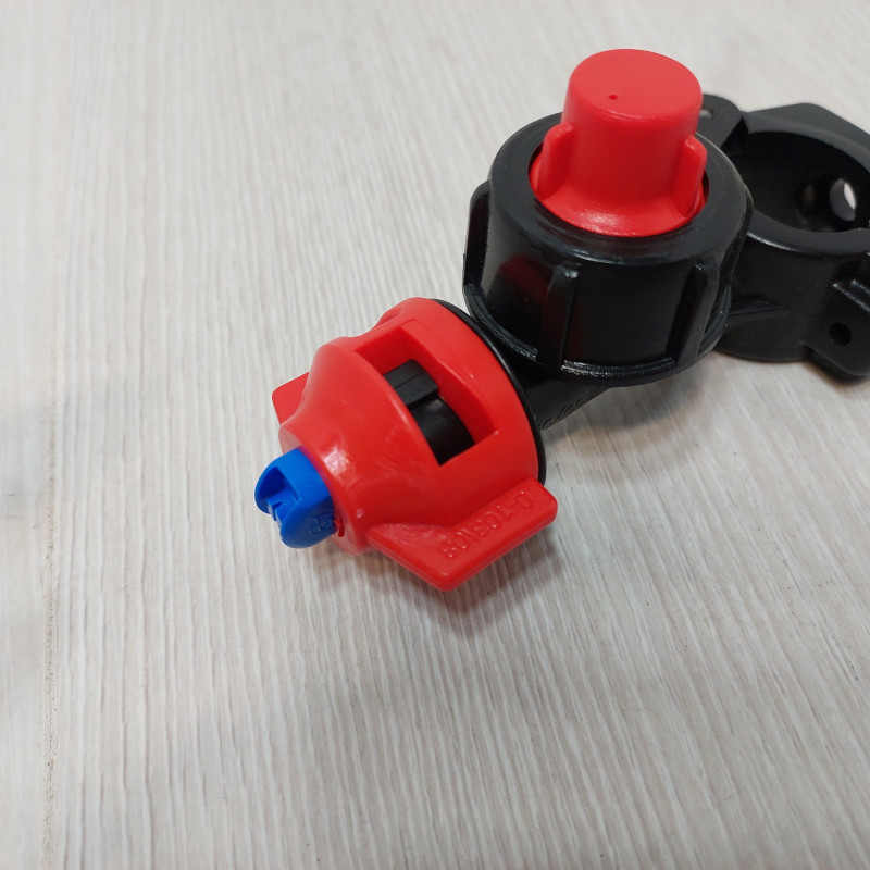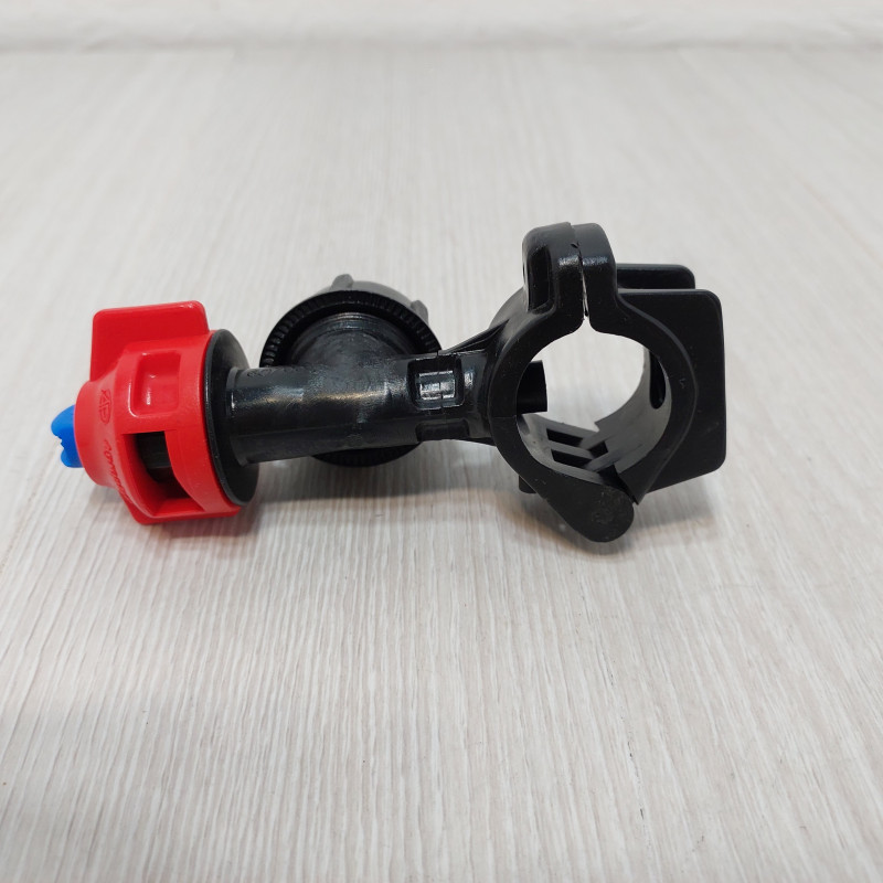 Т-образный корпус оснащен интегрированным шарнирным хомутом, который охватывает штангу диаметром 25 мм и фиксируется винтовым зажимом. Перпендикулярный выступ содержит камеру бокового мембранного отсекателя, который автоматически перекрывает подачу жидкости при падении давления ниже рабочего диапазона. Верхняя часть имеет быстросъемное байонетные крепление с красным колпачком, которое позволяет устанавливать и снимать распылитель без инструмента поворотом на четверть оборота. Такая конструкция обеспечивает быструю замену распылителей непосредственно в поле при изменении нормы внесения или переходе на другой тип обработки.