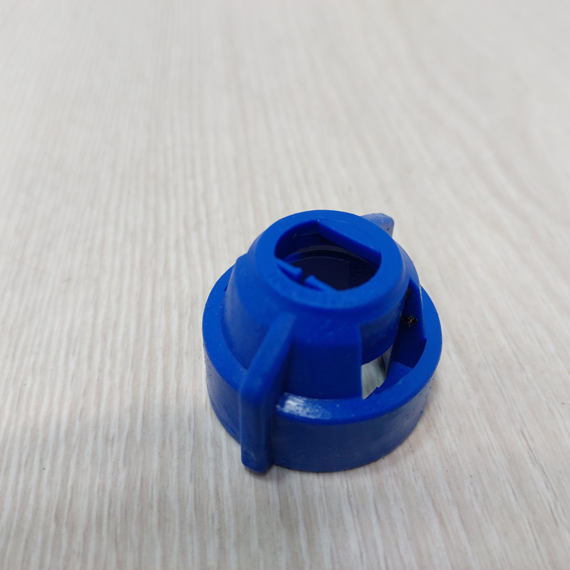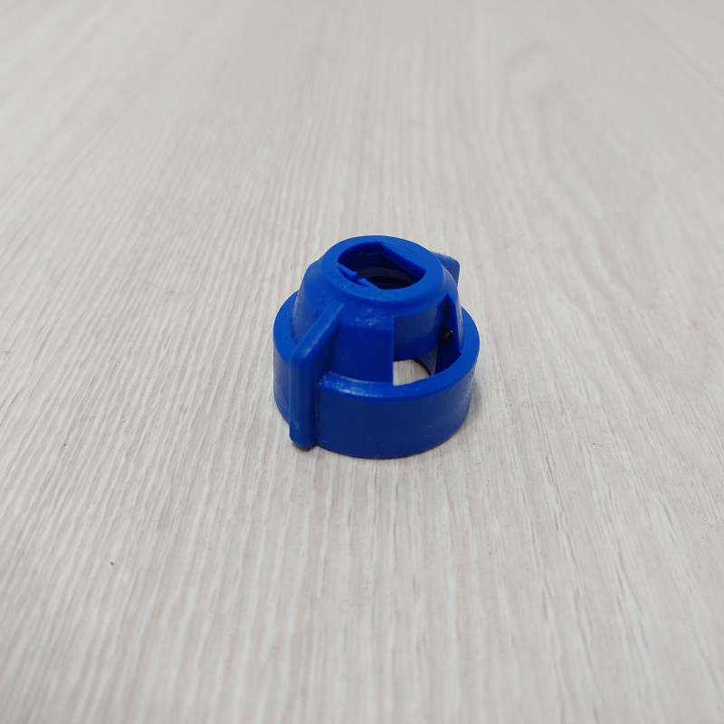 Гайка обеспечивает фиксацию и герметизацию распылителя в корпусе форсунки опрыскивателя. Колпачок надежно прижимает распылитель к уплотнению, что предотвращает несанкционированные потери рабочей жидкости во время обработки полей. Корпус синего цвета выполнен из полимерного материала цилиндрической формы с конусным переходом к верхнему отверстию. Боковая поверхность оснащена вертикальными выступами (ушками) для удобного зажимания вручную и характерными технологическими окнами.