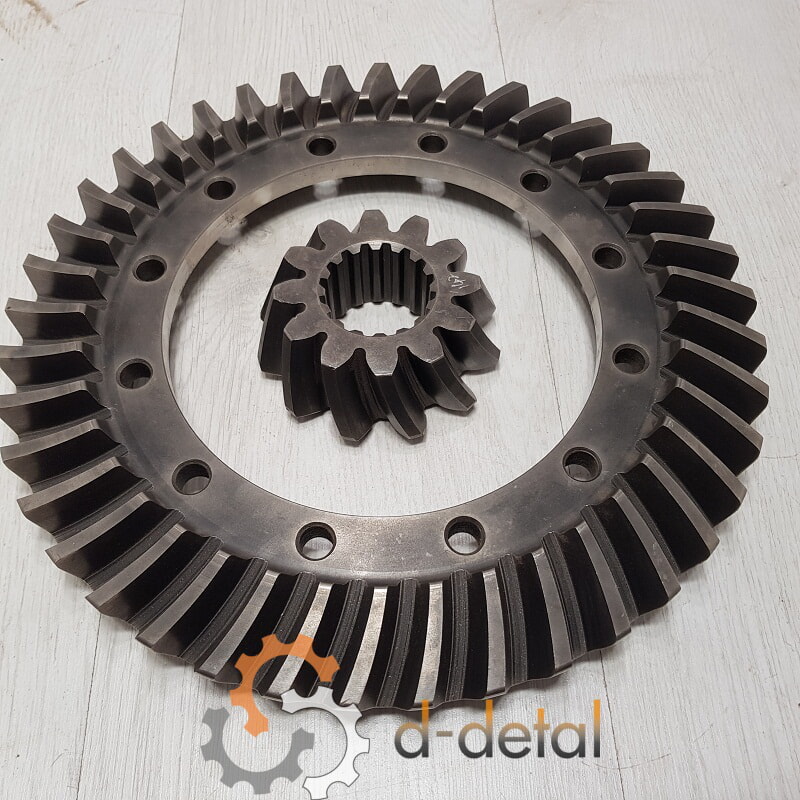 Главная пара трактора МТЗ представлена комплектом шестерен редуктора заднего моста. Он предназначен для установки на сельскохозяйственную технику производства Минского тракторного завода и состоит из двух шестерен конической формы. Зубья на обеих деталях размещены по принципу спирали. Передаточное число зубчатых колес равно 3,42.