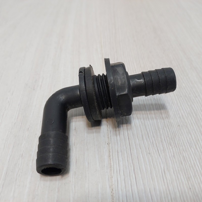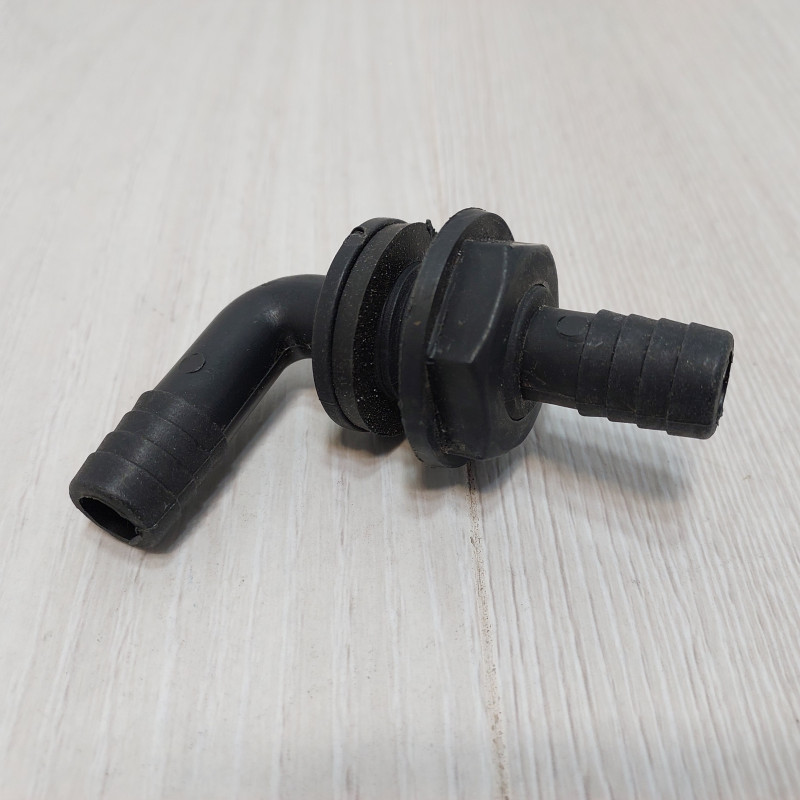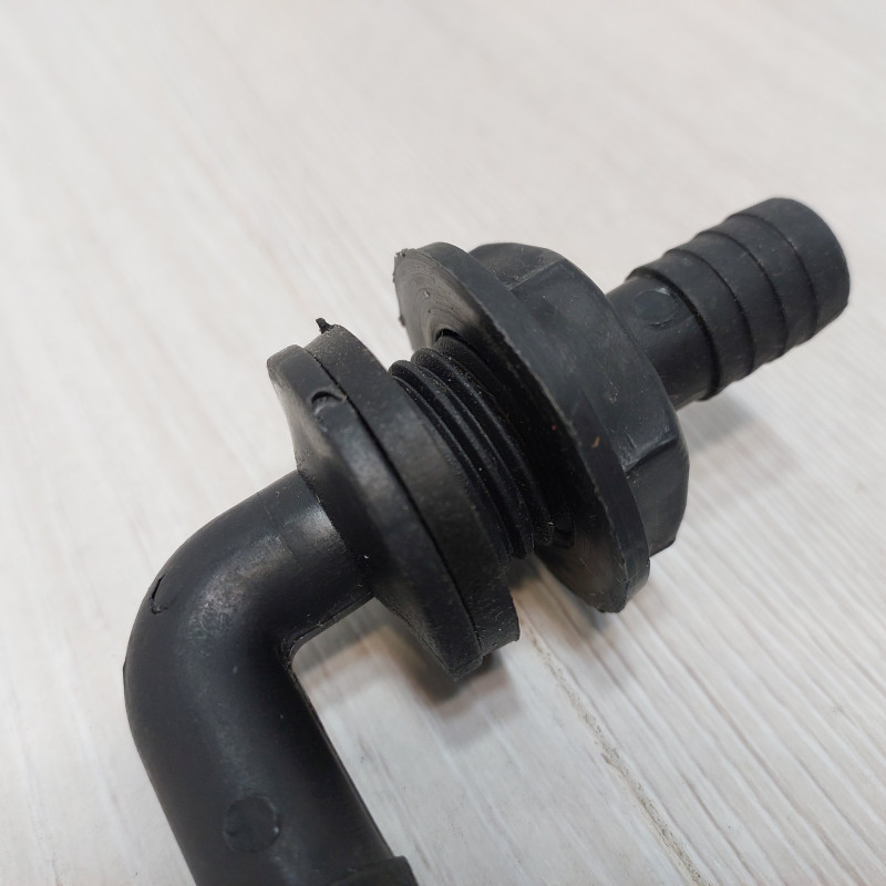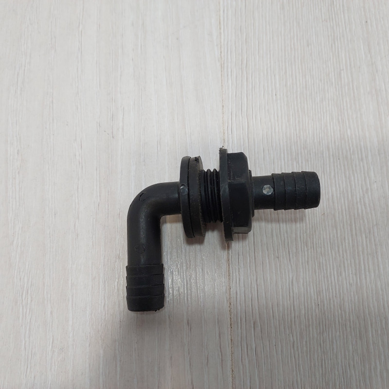 Коленчатый переходной патрубок обеспечивает герметичное соединение через стенку бака опрыскивателя и подачу рабочей жидкости к смесителю или другим узлам гидросистемы. Г-образная конструкция с углом изгиба 90° позволяет компактно организовать подключение шлангов в местах, где прямой монтаж невозможен из-за ограниченного пространства или конфигурации оборудования. Деталь изготовлена из пластика, устойчивого к агрессивным препаратам, в том числе с КАС.